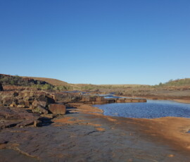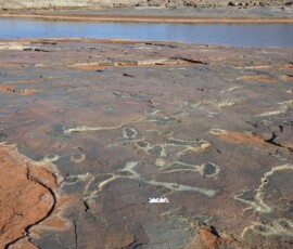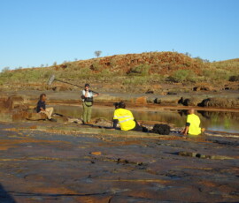 Jina is made up of extensive exposed dolerite bedrock on both sides of the Fortescue River, with footprint markings on the bedrock itself. There are several grinding patches and engravings noted at the site where people were camping while travelling through to ceremonial sites further inland.