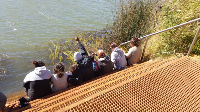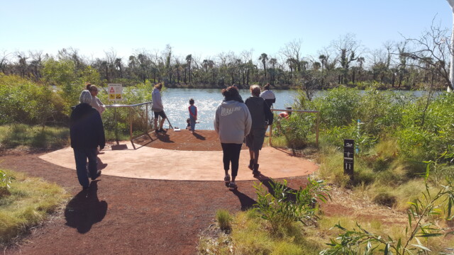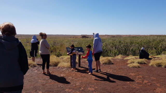 Cliff Lookout is another important part of the Jirndawirrinha cultural landscape. From the Lookout you can see an old campground located at the base of the cliff along the Fortescue River. This camp is the preferred place for swimming along the river because there is very little current. The place is linked to important sites for Yindjibarndi law and cultural practices in the area. Yindjibarndi mythology tells of a tree near Cliff Lookout that people would hold on to in case the warlu (water serpent) was upset and came after them. The warlu becomes angry if cultural practices are not adhered to when entering Yindjibarndi country. Yindjibarndi traditional custodian Michelle Adams showed Yindjibarndi children on their trip how to welcome themselves into this country, the warlu’s country.