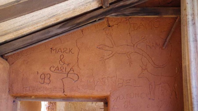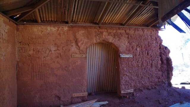 The homestead was built in 1893 and constructed with antbed mud bricks containing chopped up spinifex and dags from the woolshed which were mixed in to help it bind together. The construction was rushed due to the imminent arrival of Mrs Cusack’s son; thus the walls are only 8 feet high and the veranda has a low roof. There were no door or window frames and the openings are arched with 700 mm wide windowsills, which demonstrate unique workmanship and design for such a region in the 1890s.
