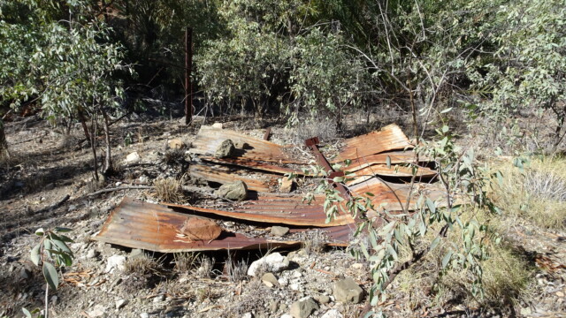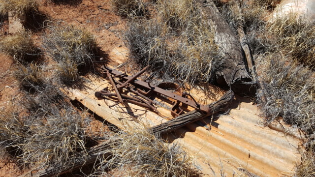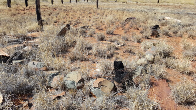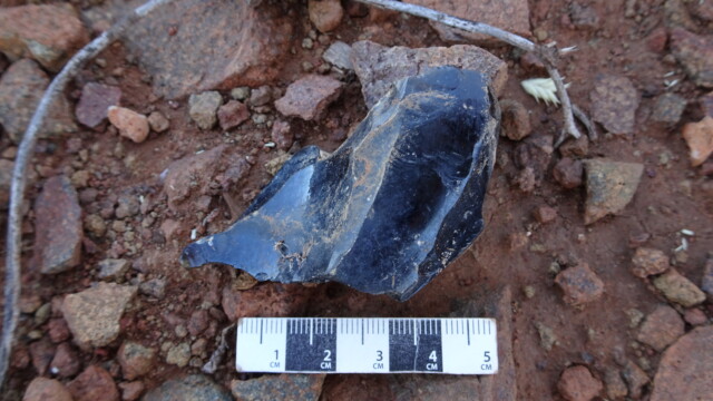 Rodney Adams and archaeologist, Ben Curtis, investigated the rockshelter and the surrounding ridgeline. This ironstone outcrop contains not only a rockshelter, but an adjacent walled niche to the north and a flaked quartz outcrop to the south. The rockshelter is 3 m high, 10 m wide and 12 m deep, which is large enough to hold a small group of people. The floor has animal poo, including kangaroo, bats, birds and goannas; plus gravel, roof-fall and a fine clay that has blown into the rockshelter during hot, dry or windy conditions. There are bullet shell casings, broken glass, flaked stone tools, and a fireplace, which indicates that people have stayed here on many occasions. During the inspection the fireplace area includes ashes, a surround, spare firewood and a kitchen knife. There are also 3 kangaroo tailbones off to the side, with 2 placed neatly together, suggesting that people continue to visit this place.