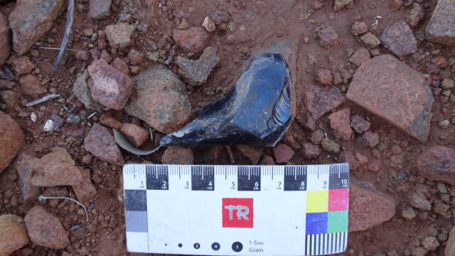 Few stone artefacts were in the rockshelter, however there was a broad grey blade made of volcanic stone, which could be dolerite. When this is worked by a skilled craftsman, called a knapper, the stone produces a sharp edge that can be used like a modern kitchen knife. There was also a grey waste-flake made during the production of the blade and another flake made of black volcanic rock.